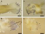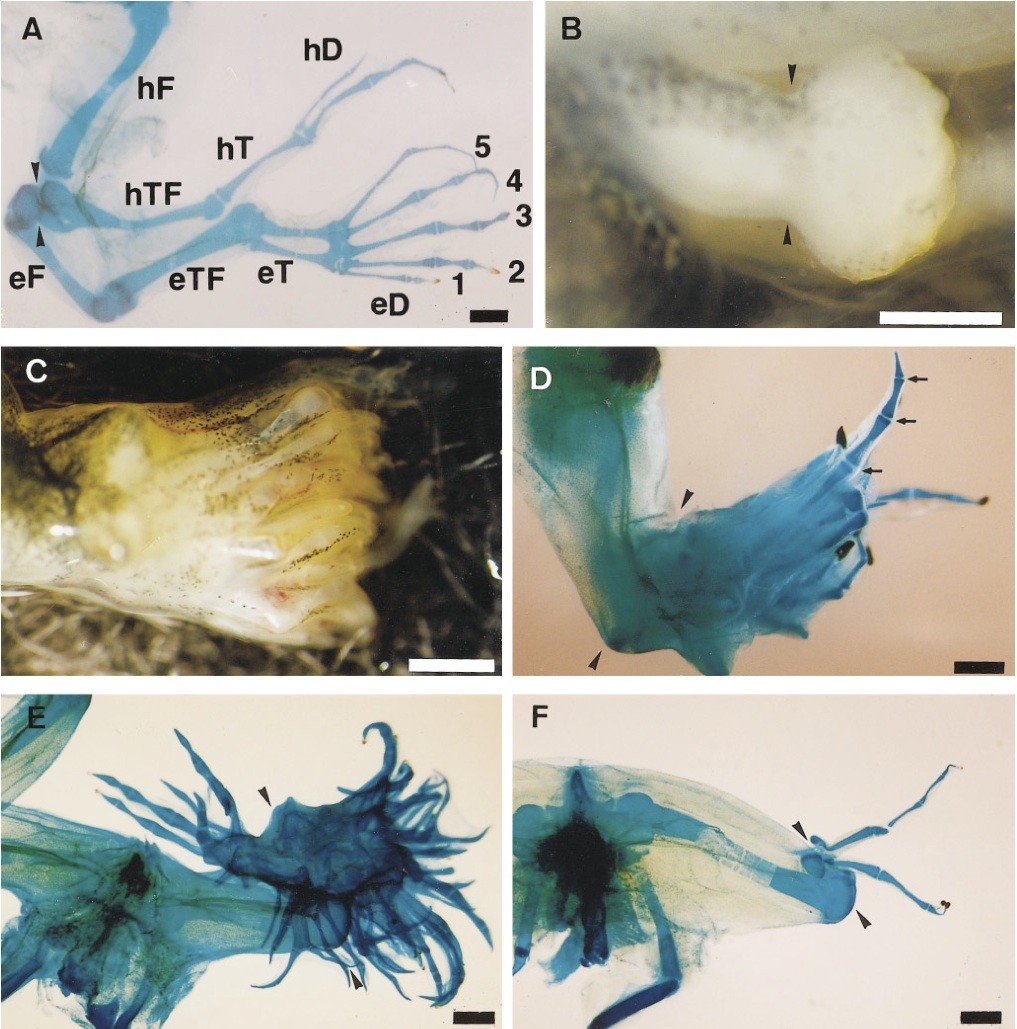 FIG. 1. Multiple digit formation with reaggregated whole mesenchyme. (A) Cartilage pattern of a recombinant with undissociated mesenchyme. Ectoderm-free limb bud mesenchyme at stage 51 was grafted onto the stage 56 limb stump amputated at knee level and allowed to develop for 30 days. An ectopic hindlimb with normal cartilage pattern was formed which included femur (eF), tibiofibula (eTF), tarsus (eT), anterior three digits with claw (eD1), and posterior two digits without claw (eD4). Host limb bud stump regenerated an incomplete pattern which included a femur (hF), a set of tibiofibula (hTF), a tarsus (hT), and two digits (hD). (B) Recombinant limbs with reaggregated stage 512 whole limb bud mesenchyme. (B) 15 days after operation. (C) 28 days after operation, before staining. Note the formation of many digits. (D) Alcian blue-stained multiple digits, 70 days after operation. Small arrows indicate cartilage segments in the digits. (E) Multiple digit formation in the recombinant with reaggregated stage 56 whole mesenchyme. Alcian blue staining. (F) Digit formation in the recombinant with reaggregated stage 58 whole mesenchyme. Alcian blue staining. Arrowheads show hostraft boundary. Bars, 1 mm.