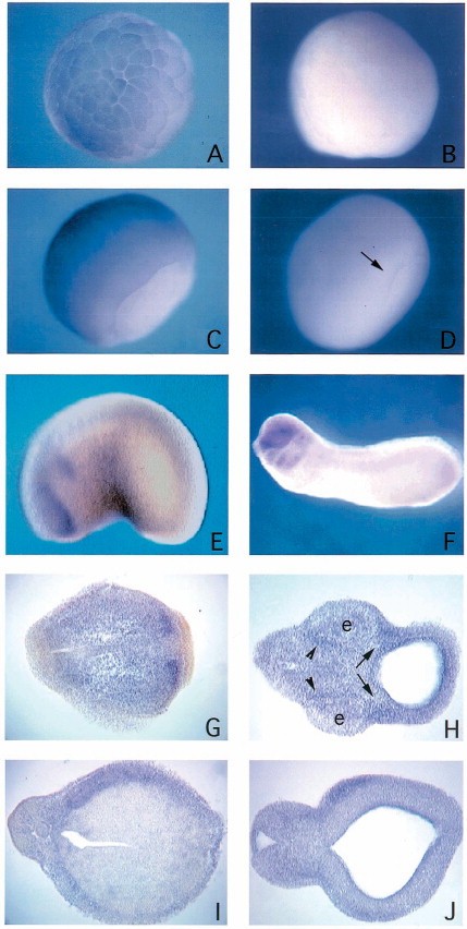 Fig. 3. Whole-mount in situ hybridisation of Xenopus albino embryos. (A,B) Stage-6 blastula showing slight positive staining of the animal hemisphere. (C,D) Stage-10.5 gastrula with positive staining of the animal hemisphere including the marginal zone. (E) Stage-23 embryo, cranial neural crest cells are stained. (F) Tailbud stage 28, staining was found in the mandibular crest segments surrounding the eye anlage and in the hyoidal and the branchial crest segments. (G) Transverse section through the head region of the stage-23 embryo shown in (E), mandibular crest cells lining the cement gland are labelled. (H) Transverse section through the head region of the stage-28 embryo shown in (F), mandibular crest cells (MCS) surrounding the optical vesicle are stained. Arrowhead, dorsal portion; arrow, caudoventral portion of MCS. (I) Transverse section through the trunk region of the stage-23 embryo shown in (E), staining is observed in the lateralmesoderm. (J) Transverse section through the trunk region of the stage-28 embryo shown in (F), staining is observed in the sclerotome and in both layers of the lateralmesoderm. (A,C,E,GâJ) Anti-sense probe. (B,D) Sense probe. Arrow in (D) marks the blastopore lip. Dorsal side of the embryos shown in (EâJ) are orientated to the left-hand side.