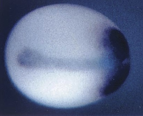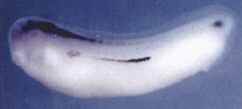 not (notochord homeobox) gene expression in Xenopus laevis embryo, assayed via in situ hybridization, NF stage 14, dorsal view, anterior left.