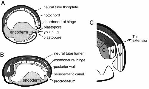 opening of the neuroenteric canal is continuous with the neural tube lumen. (C) Enlarged schematic showing the posterior region of (B). The relative