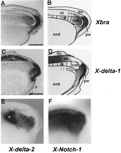 in the tail bud. (E) X-delta-2 expression is primarily in the most posterior