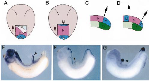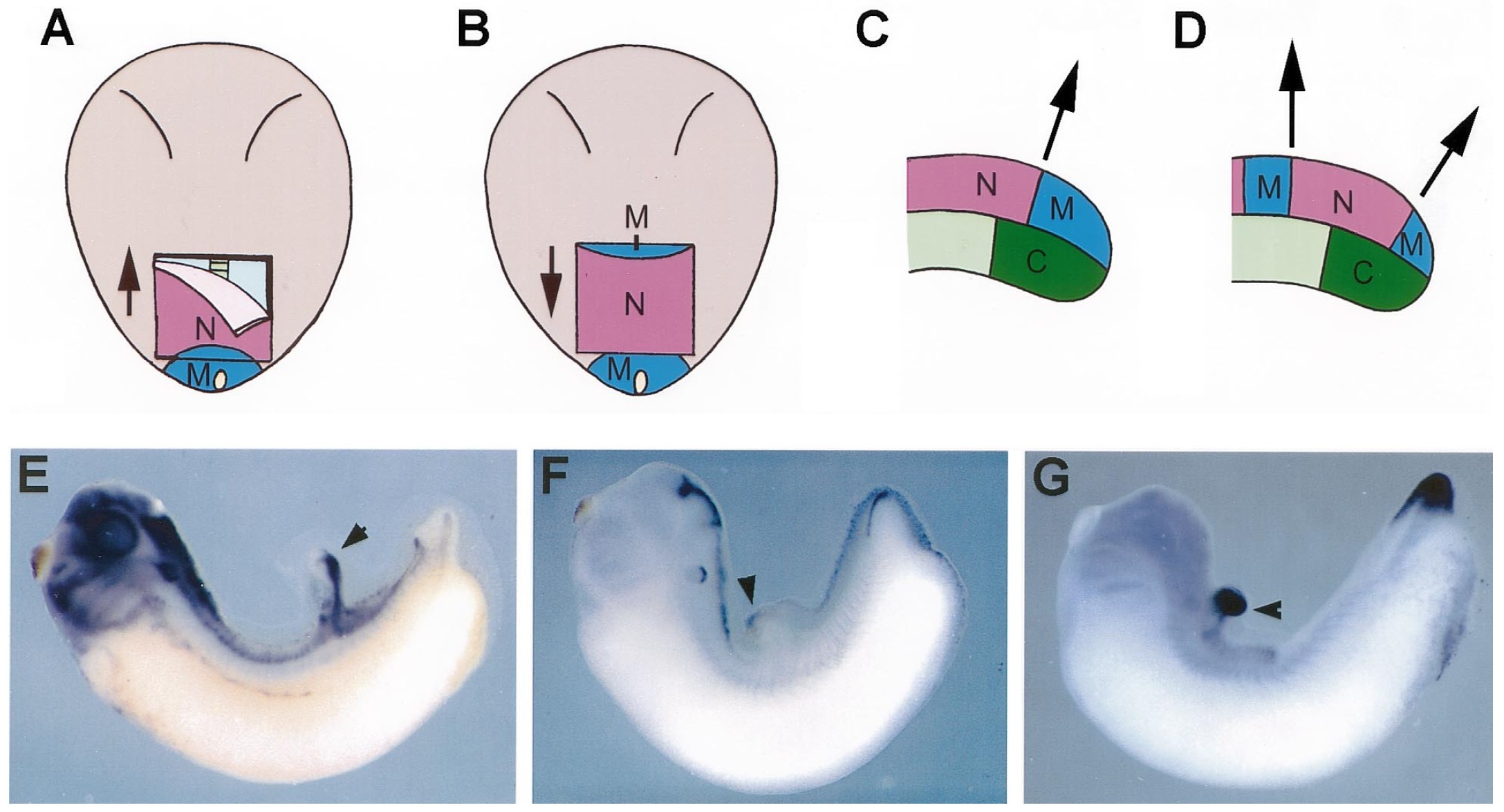 Fig. 8. Orientation of late gene expression recapitulates the polarity of the NM junction. (A) Diagram to illustrate the neural plate rotations used to generate an extra tail with reversed orientation of N and M. (A) A region of the neural plate 600 600 mm is peeled from an embryo at stage 14. The region