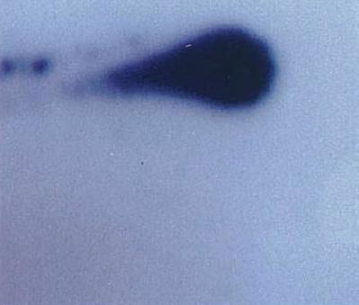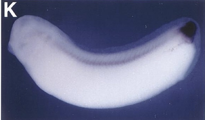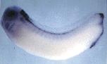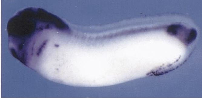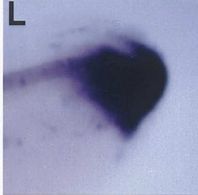lim1 gene expression in Xenopus laevis embryo, tail region only, assayed via in situ hybridization, NF stage 29 & 30, lateral view, anterior left, dorsal up.