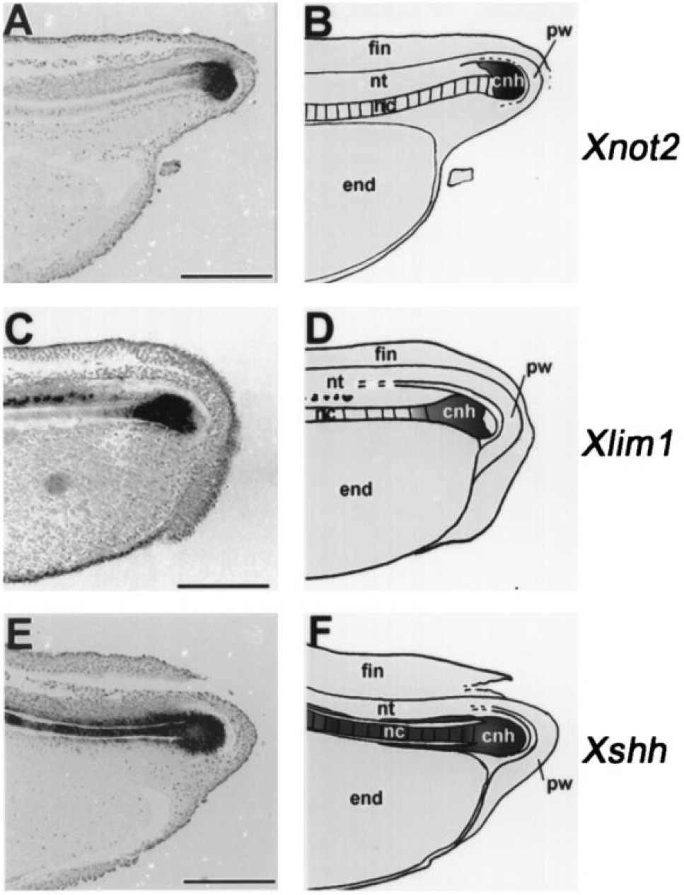 cnh, chordoneural hinge; end, endoderm; nc, notochord; nt, neural tube;
