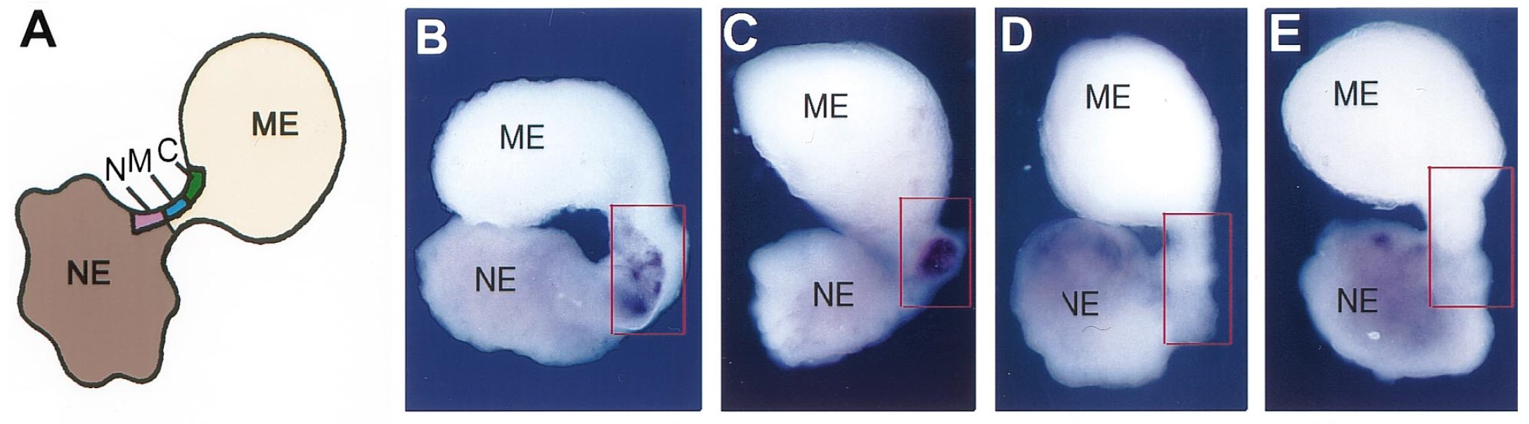 Fig. 7. The expression of late genes depends on correct initiation of the tail bud at stage 13. (A) Schematic diagram of exogastrula to show the position of the tail bud forming region and location of N, M and C on the dorsal side of the waist region. The waist region links the mesoendoderm (ME) and the neuroectoderm (NE) posterior to posterior and the dorsal side corresponds to the chordoneural hinge. (B) whole mount in situ hybridisations to exogastrulae at stage 32. Dorsal views with mesoendoderm uppermost, red boxes mark the hinge region, other blue spotting in the neuroectodermal sac is due to trapping of the probe. (B) Exogastrula showing expression of Xnot2 in the unfolded chordoneural hinge. (C) Expression of Xcad3 in the hinge