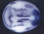cdx4 (caudal type homeobox 4 ) gene expression in Xenopus laevis embryo, assayed via in situ hybridization, NF stage 14, dorsal view, anterior left.