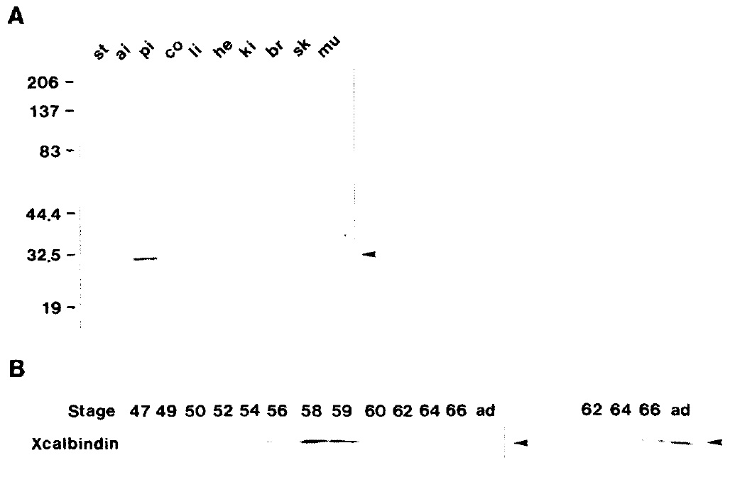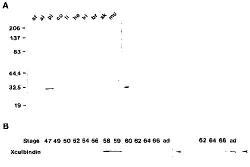 proteins was run on SDS-PAGE, blotted, and stained with anti-Xcalbindin antibody. ad, adult. Arrows at the right side of gels point to