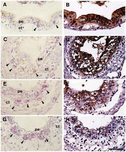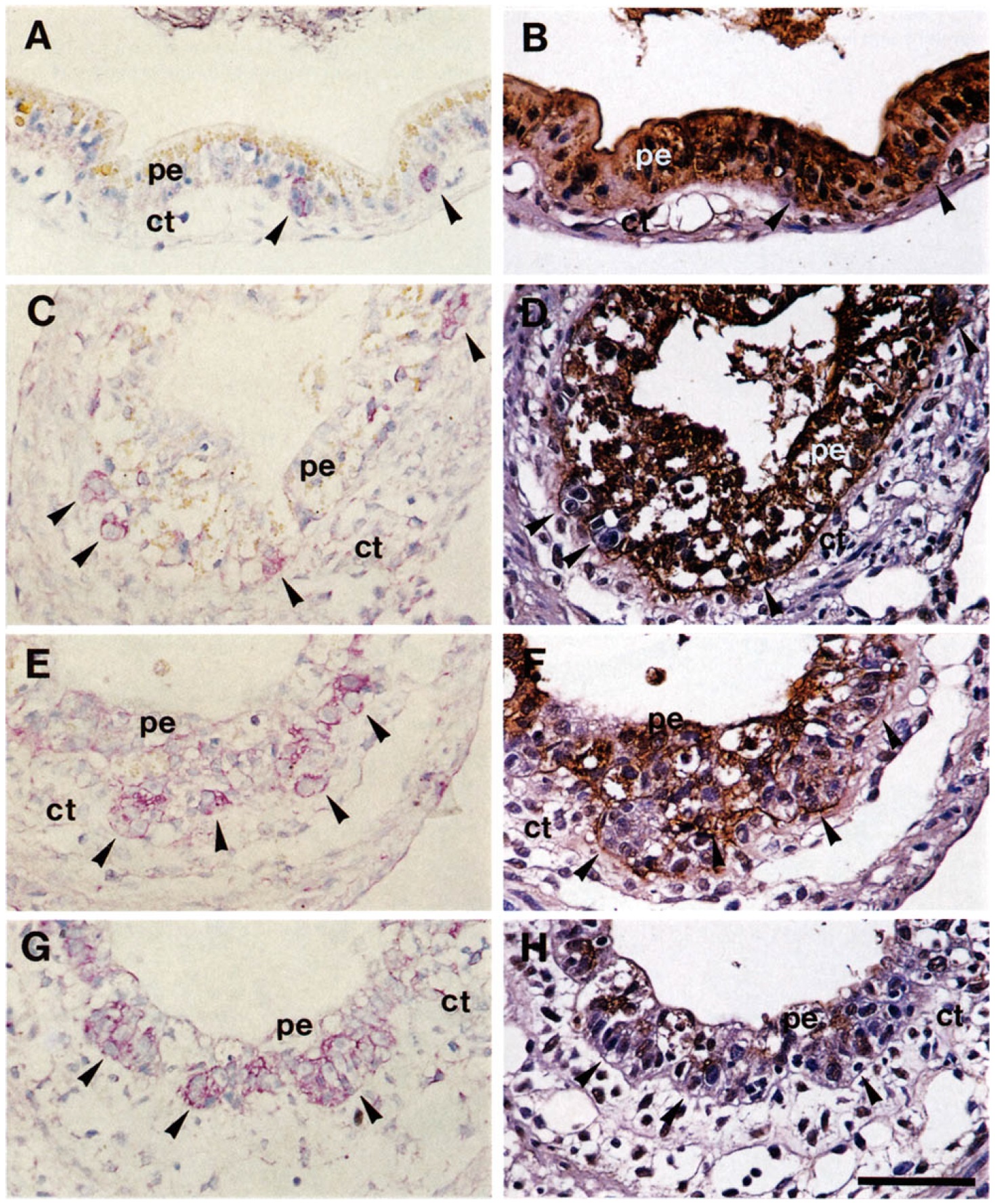 antibody (B,D,F,H). The vision field of B,D,F,H corresponds to that of A,C,E,G, respectively. ct, connective tissue; pe, primary epithelium.