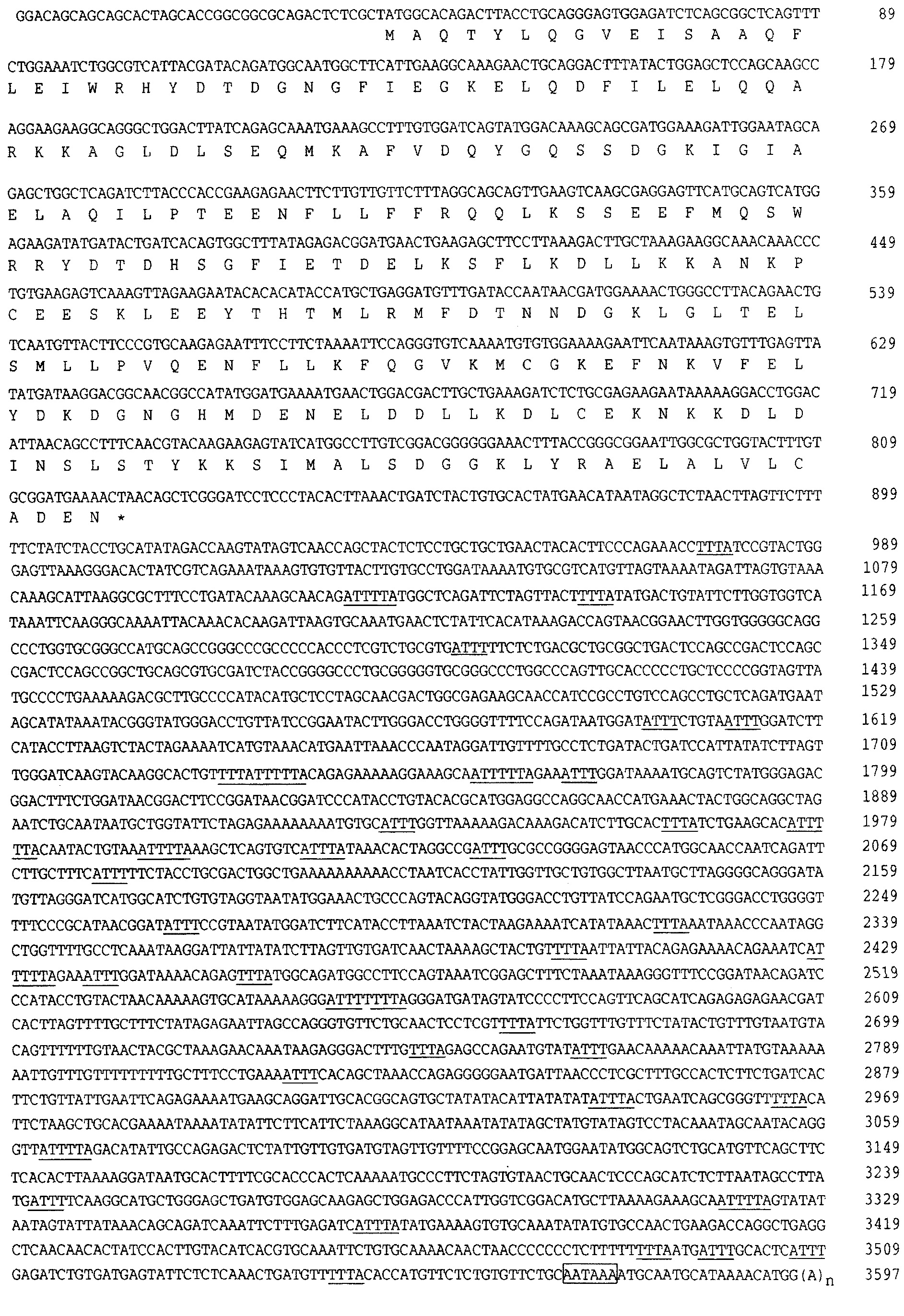 the stop codon marked by an asterisk, and 2676 bases in a 3'-untranslated region. Five polyadenylation signals (AATAAA) are present,