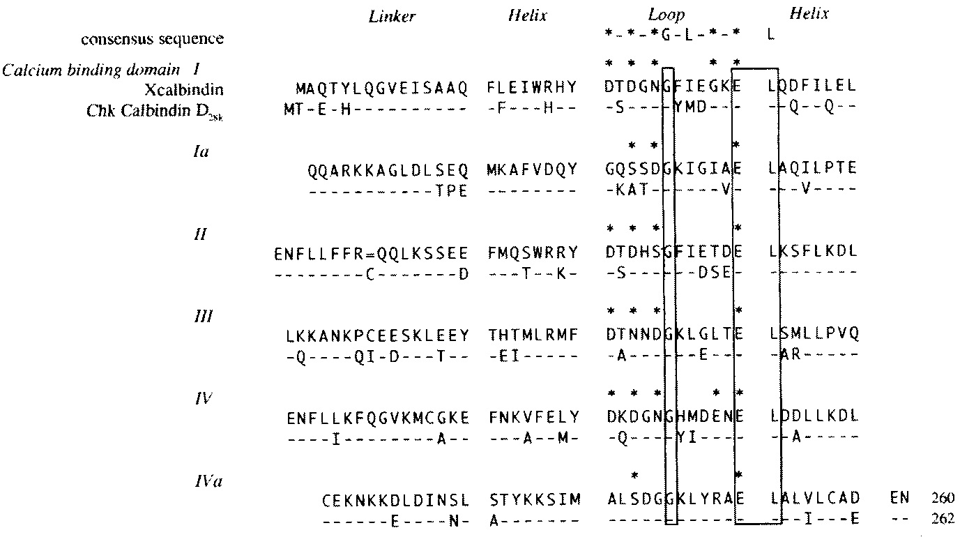 II of Xcalbindin indicate common amino acids and a gap, respectively. Calcium is shown to bind the EF-hand structure (Kretsinger