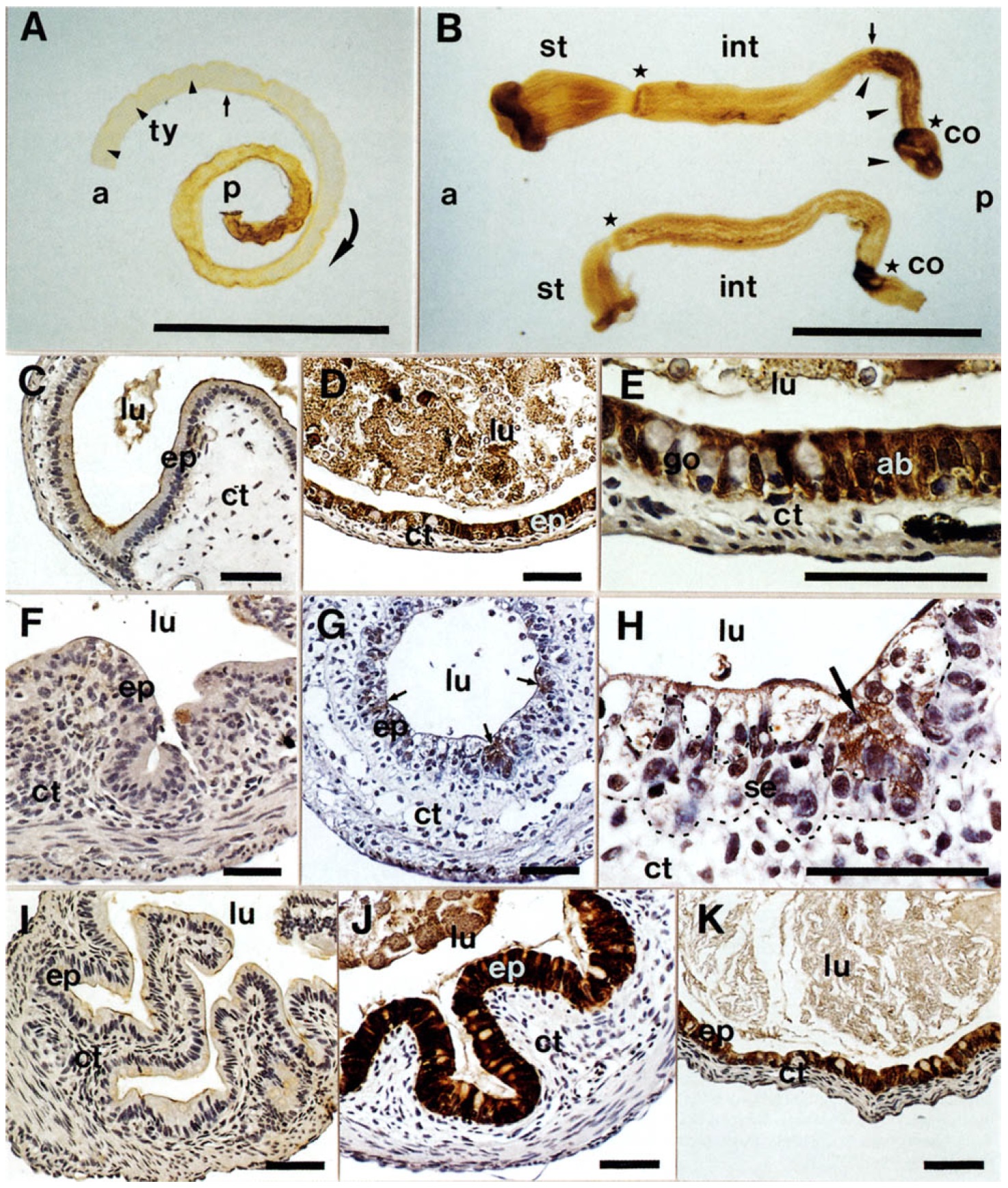colon. Bar, 5 mm (C-K) Cross-section immunostaining. C,F,I, anterior part; D,E,G,H,J,K, posterior part; C-E, stage 57; F-H, stage 60;