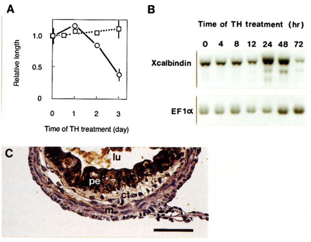 5 mm. (B) Whole-mount immunohistochemistry of the digestive tract at stage 66 (froglet). The upper organ was stained with antiXcalbindin