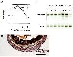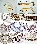 respectively. A curved arrow at the right side of the organ points to the region that started to be weakly stained by the antibody. Bar,