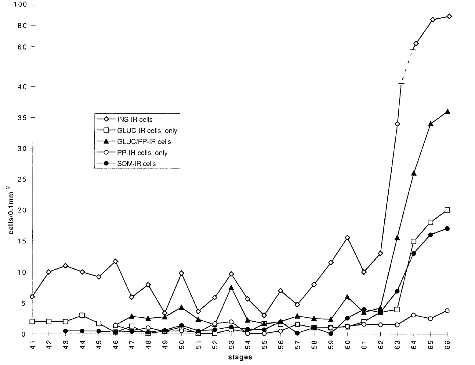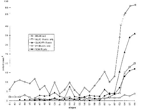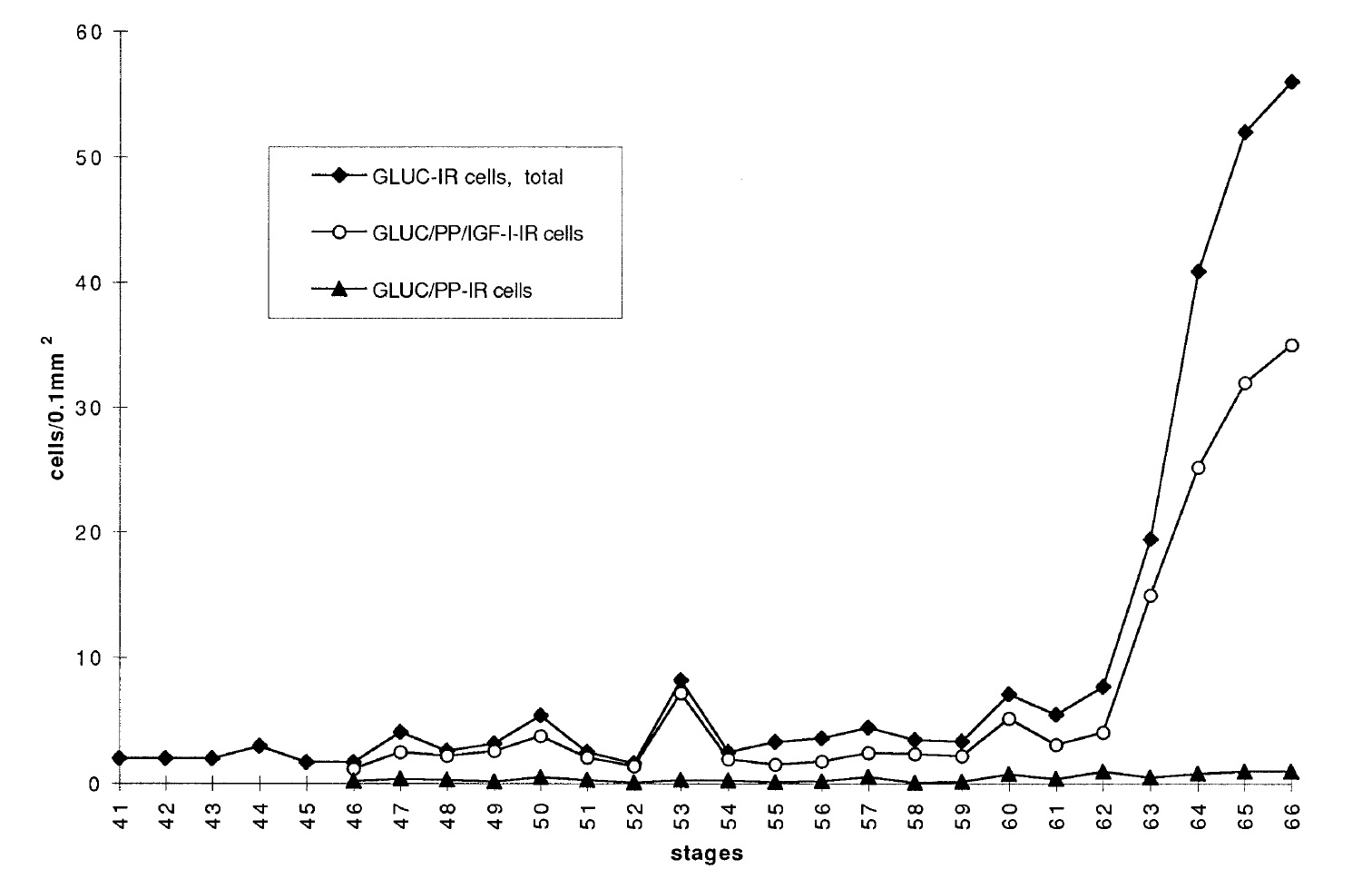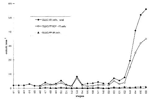 FIG. 2. Number of the different subtypes of GLUC-IR cells per 0.1 mm2 pancreatic tissue in Xenopus during development.