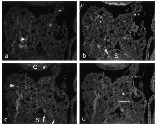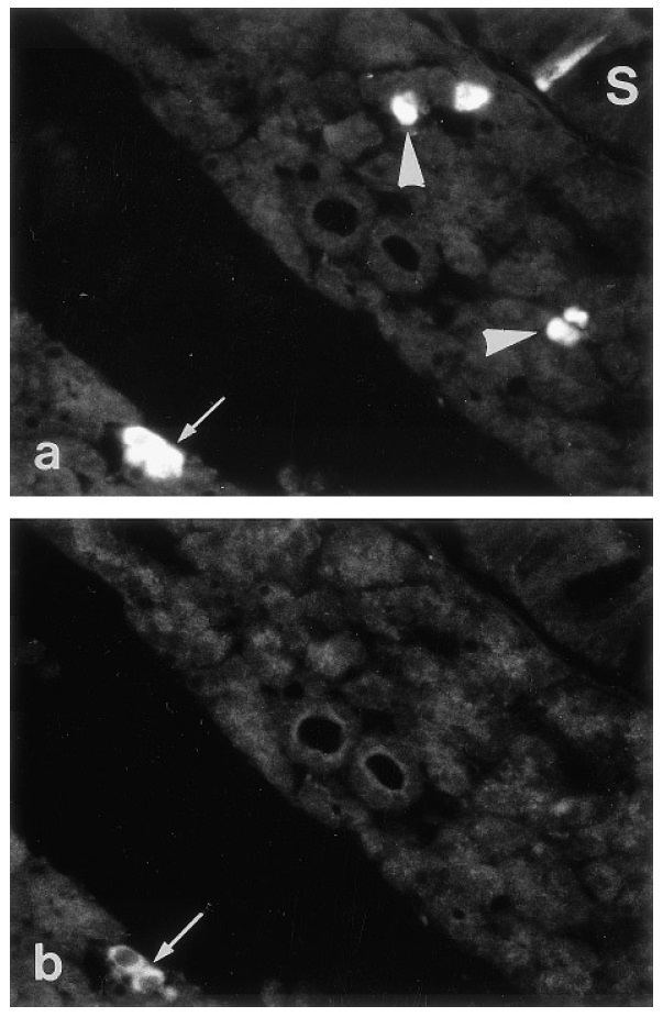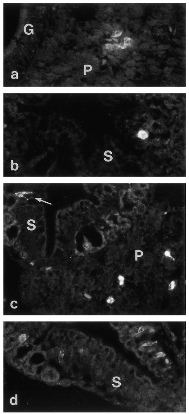 (S) mucosal epithelium (arrow).3280. (d) Several SOM immunoreactive