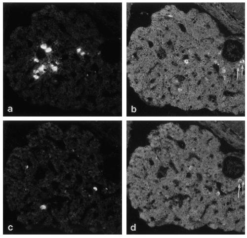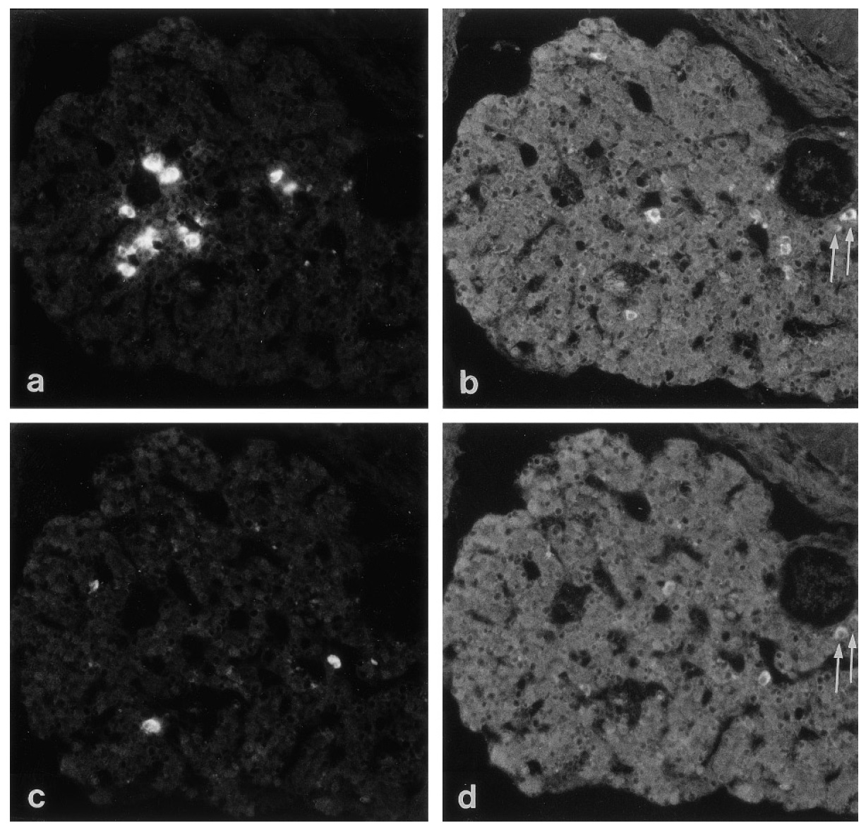 pancreas. Some GLUC-IR cells (arrows) exhibit PP immunoreactivity in coexistence (d). 3200.