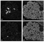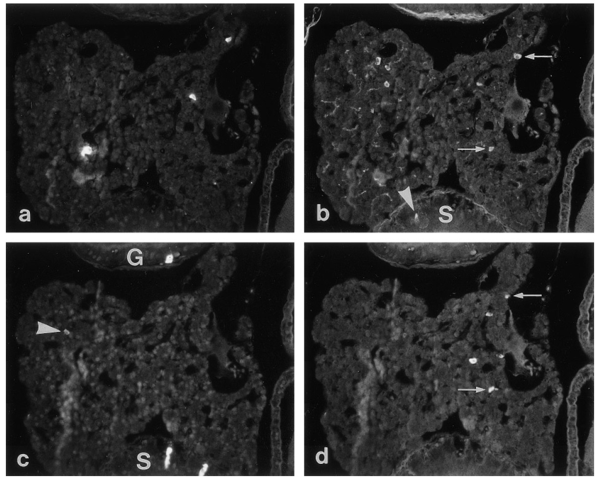 SOM (c) and PP (d). (a) INS-IR cells occur in a small islet and singularly. (b) GLUC-IR cells are found distributed throughout the exocrine