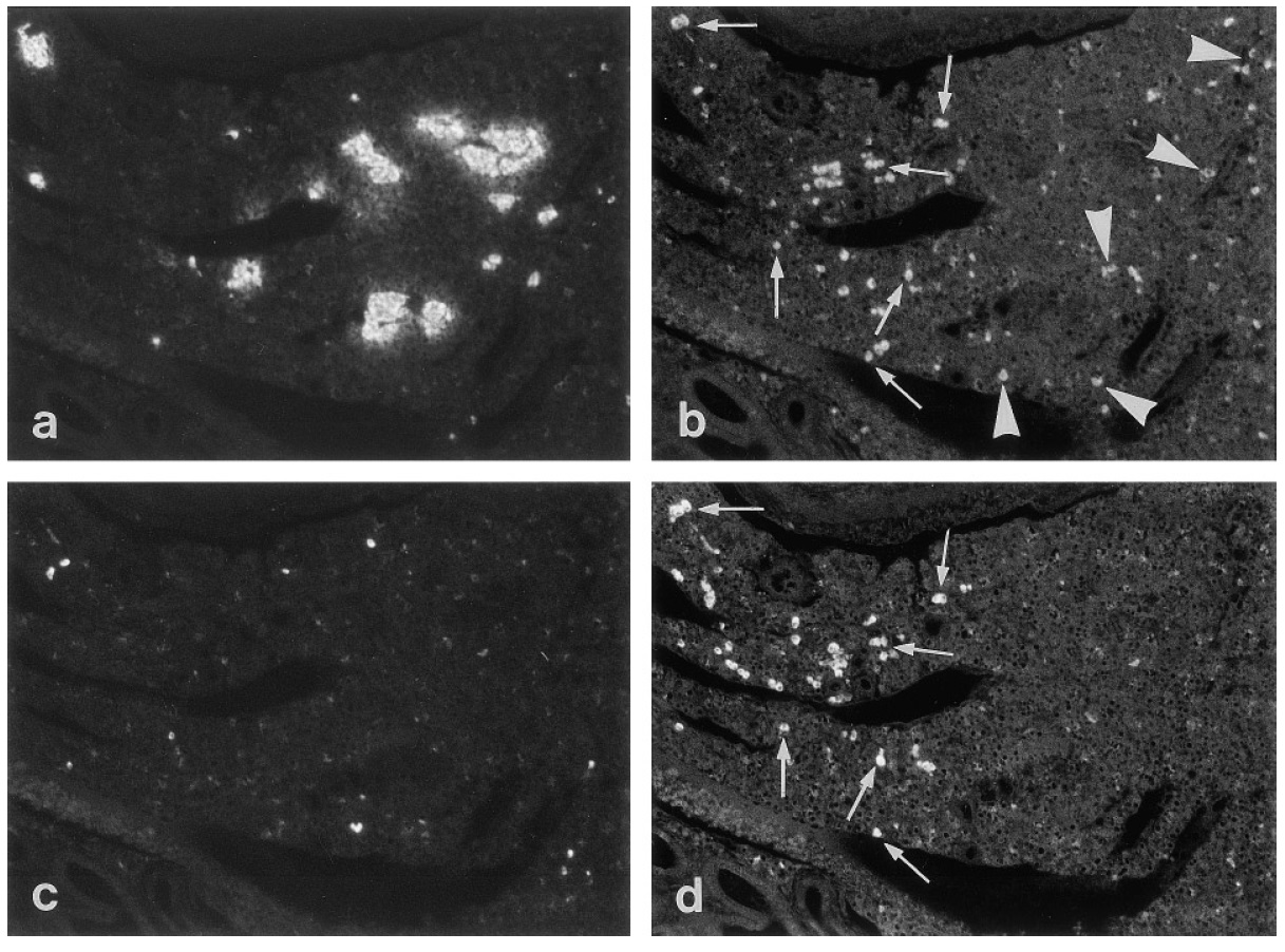 GLUC-IR cells in the left portion contain PP immunoreactivity (d) (arrows) while the other GLUC-IR cells (arrowheads) do not. (c) Few