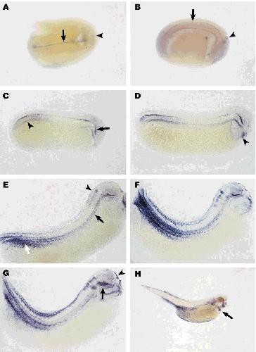 Fig. 6.Spatial pattern of expression of TSP-1 mRNA. Whole mount in situ hybridization, using digoxygenin-labeled antisense TSP-1 probes, was performed on albino Xenopus embryos. Experiments with TSP-1 probe in the sense orientation were regularly performed to control for specificity and these embryos lacked detectable staining (data not shown). Each embryo is oriented with anterior to the right. Embryos were staged according to Nieuwkoop and Faber (1994). Stage 19 neurula, (A) dorsal view (B) side view. Arrows indicate single line of cells along the dorsal midline. Arrowheads indicate bilaterally symmetrical staining in the hindbrain. C: Stage 26 tailbud, side view. Arrow indicates floor of forebrain. Arrowhead indicates endoderm ventrally apposed to the notohord. D: Stage 28 tailbud, side view. Arrowhead indicates epidermal staining surrounding the cement gland. E: Stage 30 tailbud, side view. Arrowhead indicates hindbrain staining in alternating rhombomeres. White arrow points to expression in the caudal somites. Black arrow indicates notochord staining. F: Stage 32 tailbud, side view. Note the increased staining within caudal somites and rhombomeres in comparison to (E). G: Stage 34 tailbud, side view. Arrow indicates intense expression in the pre-chordal plate. Arrowhead points to expression in anterior epidermis. H: Stage 40 tadpole, side view. Arrow indicates staining in the heart. Note the lack of somitic expression.