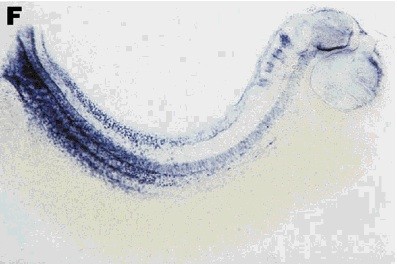 thbs1 (thrombospondin 1) gene expression in Xenopus laevis embryo, NF stage 40, assayed by in situ hybridization, lateral view, anterior right, dorsal up.