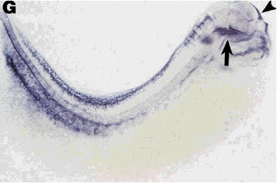 Fig. 8. Spatial patterns of expression of TSP-3 mRNA. Whole mount in situ hybridization was performed on albino Xenopus embryos with digoxygenin-UTP labelled antisense TSP-3 probes. All embryos are oriented so that anterior is to the right except for F and G which are transverse sections with dorsal oriented to the top. A: Side view of a stage 13 neurula, arrowhead indicates staining along the dorsal midline corre- sponding to the notochord. B: Similar stage embryo to that in (A) viewed from the top. Arrowhead indicates the notochord. C: Stage 19 neurula, side view. Arrow points at the notochord and the arrowhead indicates the floor-plate of the neural tube. D: Stage 26 tailbud, side view. Stained notochord and floor plate are visible along the length of the embryo.