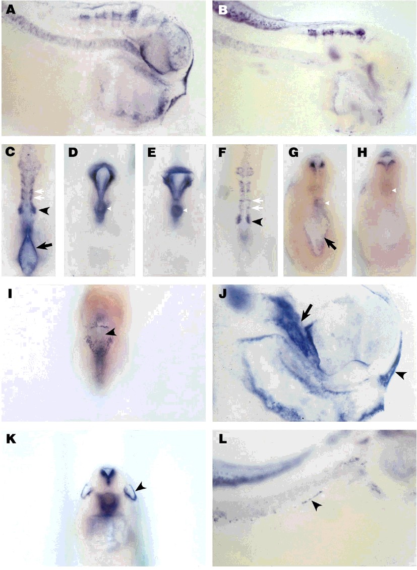 Fig. 7. The spatial pattern of TSP-1 mRNA expression in tailbud stage embryos. Whole mount in situ hybridization was performed on albino Xenopus embryos fixed at 2 hour intervals from stage 24 through stage 34. Pictured embryos are stage 34 and oriented with anterior to the right and dorsal to the top unless otherwise noted. (C) are views of different optical sections of the embryo in (A), (F) are views of the embryo in (B). (C) and (F) are views from the dorsal side (horizontal) and (D, E, G, H) are different focal planes when viewed from the front (transverse). White arrows indicate staining concentrated in the anterior and posterior limits of r2 and white arrowheads point to the notochord. Black arrowheads indicate expression in the anterior region of r1. Large arrows in (C) and (G) point to nonspecific background staining in the brain ventricle and gut respectively. (D) and (G) are optical transverse sections at the level of the anterior region of r1. (E) is an optical transverse section at the level of r2 and (H) at the level of r4. I: Stage 33 tailbud, frontal view with dorsal oriented to the top of the page. Arrowhead indicates central region of facial epidermis that is devoid of TSP-1 staining. J: Side view of a stage 34 tailbud, arrow indicates intense expression in the pre-chordal plate. Note the strong staining in the region of the brain in contact with the pre-chordal plate. Arrowhead indicates facial epidermal staining. K: Stage 34 tailbud with the focal plane at the level of r4. Arrowhead indicates intense expression within the otic vesicle. L: Stage 33 tailbud, side view in trunk region. Arrowhead indicates TSP-1 mRNA expressing cells at the location of a major blood vessel.