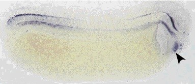 thbs1 (thrombospondin 1) gene expression in Xenopus laevis embryos, NF stage 26, as assayed by in situ hybridization, lateral view, anterior left, dorsal up.