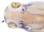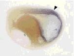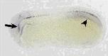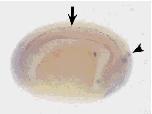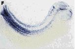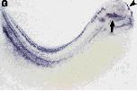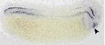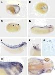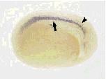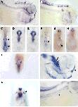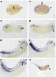 Arrowhead indicates sensorial layer of the ectoderm. E: Side view of a stage 33 tailbud. F: Optical transverse section in the trunk of a stage 30 tailbud. Arrowhead indicates sensorial layer of ectoderm, arrow points to the floor-plate of the neural tube. G: Transverse paraffin section of a whole-mount stained, stage 33 tailbud, through the hindbrain. Arrowhead points to expression in the roof plate, which was cracked during process- ing. H: Stage 35 tailbud, side view. White arrowhead indicates the intensely stained floor plate of the brain. I: Top view of the head of a stage 40 tadpole. Arrowhead indicates auditory epithelium. Black arrow points to olfactory epithelium, slightly out of the plane of focus and white arrow indicates staining in the epidermis.