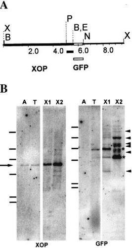 Integration of rhodopsin promoterâGFP construct into the Xenopus genome. A: Map of the transgene construct pXOP(â5500/+41)GFP. On the mapline, the 5.5 kb Xenopus principal rod opsin promoter is shown as a solid box and the GFP coding region as an open box. Below the line are shown the probes for Southern analysis. The size marks are in kb and enzyme sites are shown: X, XhoI; B, BamHI; P, PstI; N, NotI; E, EcoRI. B: BamHIâdigested DNA from 2 month old tadpoles expressing GFP in the eye (X1, X2), control adult (A) and control tadpole (T) were analyzed by Southern blot using XOP (left) or GFP (right) probes. Arrow indicates the position of the endogenous 5.5 kb BamHI XOP fragment, arrowheads indicate major bands specific to the GFPâexpressing tadpoles and asterisks indicate nonâspecific hybridizing species found only in tadpole DNA. The size markers were λ HindIII digest in kb: 23.1, 9.4, 6.6, 4.4, 2.3 and 2.0.