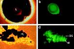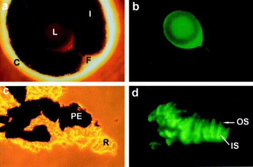An enucleated eye from a transgenic tadpole illuminated under bright field (a) or blue light (b). The position of the lens (L), iris (I), choroid (C) and embryonic fissure (F) which is not closed at this stage are indicated. A piece of whole mounted retina from the same eye is shown under bright field (c) and blue light (d). The rod outer (OS) and inner (IS) segments are indicated.