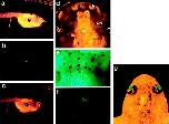 Figure 2 . Lateral view of a transgenic tadpole [Xla.Tg(rho:Eco.nfsA)] (stage 51) under bright field illumination (a), blue light (b) or both (c, the tungsten lamp was dimmed compared to a). The bright green fluorescence from the transgene is seen in the eye. d: Dorsal view of a transgenic tadpole (stage 48) under bright field illumination. The position of the eyes (e), optic nerve (on), olfactory organ (o), cerebral hemispheres (c) and pineal (p) are indicated. A higher magnification image of the pineal under bright field (e) and blue light (f). GFPâspecific fluorescence is seen as a punctate pattern in pineal. g: The anterior portion of a transgenic juvenile frog illuminated with both tungsten lamp and blue light.