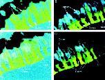 Figure 4 . Confocal images of a retina from a transgenic tadpole [Xla.Tg(rho:Eco.nfsA)Zuber] produced using pXOP(â5500/+41)GFP. Two separate sections are shown (A and B, C and D). The images under bright field (A, C) were obtained with both bright field and blue light, so the GFP fluorescence (green) is visible in these images. Sections were also viewed for fluorescence from GFP (green) and Cy3 which revealed B630N rod opsin staining (blue) (B, D). Cones are indicated, as well as opsinâ and GFPâpositive rods.