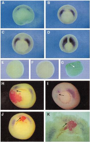 blue in I) suppress Myf-5 expression over a distance of 3â5 cells (arrows). (J) A small clone of BMP-4-producing cells within the dorsal
