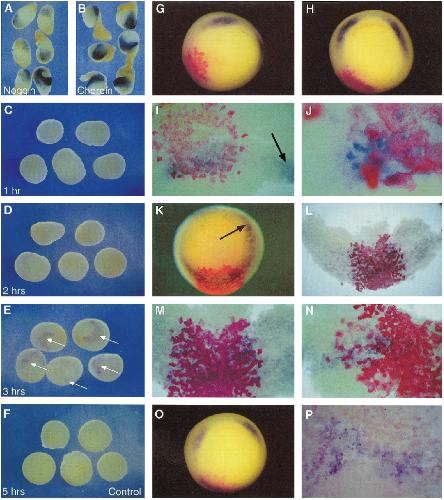 animal caps cause activation of Myf-5 expression (denoted by white arrows) within 3 h (E) of combination with ventral marginal zone tissue. No Myf-5 transcripts are detected at 1 or 2 h (C and D). Control ventral marginal zones do not express Myf-5 (F). (GâP) Myf-5