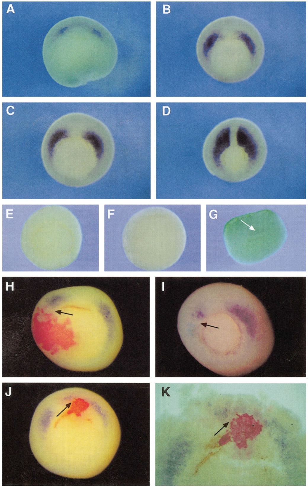 noggin-expressing clones (100 pg RNA) induce a domain of Myf-5 expression in the ventral marginal zone. (I and J) Flat-mount