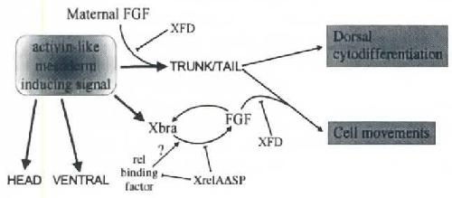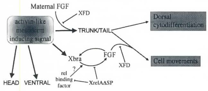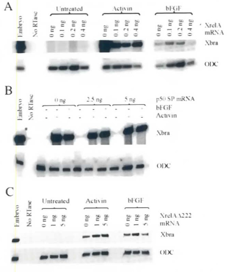 In this report, we have used mRNA injection to study the action of mutants of XrelA, a Xenopus homolog of the RelA (p65) component of NF-kappaB, on the induction of mesoderm in Xenopus embryos. A region of the rel homology domain of XrelA was deleted to create XrelA deltaSP, which retains the dimerization and activation domains, but no longer binds to DNA. We also made an analogous derivative of mammalian NF-kappaB1 (p50). We show that both constructs have dominant inhibitory activity. When message encoding either is injected into eggs or oocytes, DNA binding of rel family members is suppressed, as is transactivation of a kappaB-dependent promoter in embryos. Expression of XrelA deltaSP in animal caps blocks the induction of mesoderm by bFGF. In addition, this mutant prevents elongation movements generated by activin, but has little effect on posterior dorsal cytodifferentiation, which in marked contrast is blocked by inhibition of the FGF signal transduction pathway between the receptor and MAP kinase. The specificity of the XrelA deltaSP effect on FGF signaling is shown by rescue of mesodermal marker expression when XrelA deltaSP is co-expressed with a specific rel inhibitor. The target of these dominant negative constructs seems to be neither XrelA itself, nor p50, but rather some other molecule with which XrelA, rather than NF-kappaB1, heterodimerizes. We show that XrelA deltaSP blocks FGF induction of mesoderm downstream of MAP kinase and Xbra expression. Thus it prevents the maintenance of Xbra expression by inhibiting its autoregulation by embryonic FGF (eFGF). We suggest that XrelA deltaSP differs from other reported inhibitors of FGF signaling because it inhibits only gastrula stage FGF signaling and not the maternally programmed signaling at the blastula stage. Our results therefore suggest that zygotic FGF action is required for cell movements rather than dorsal differentiation.