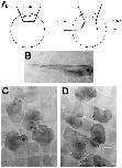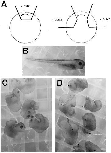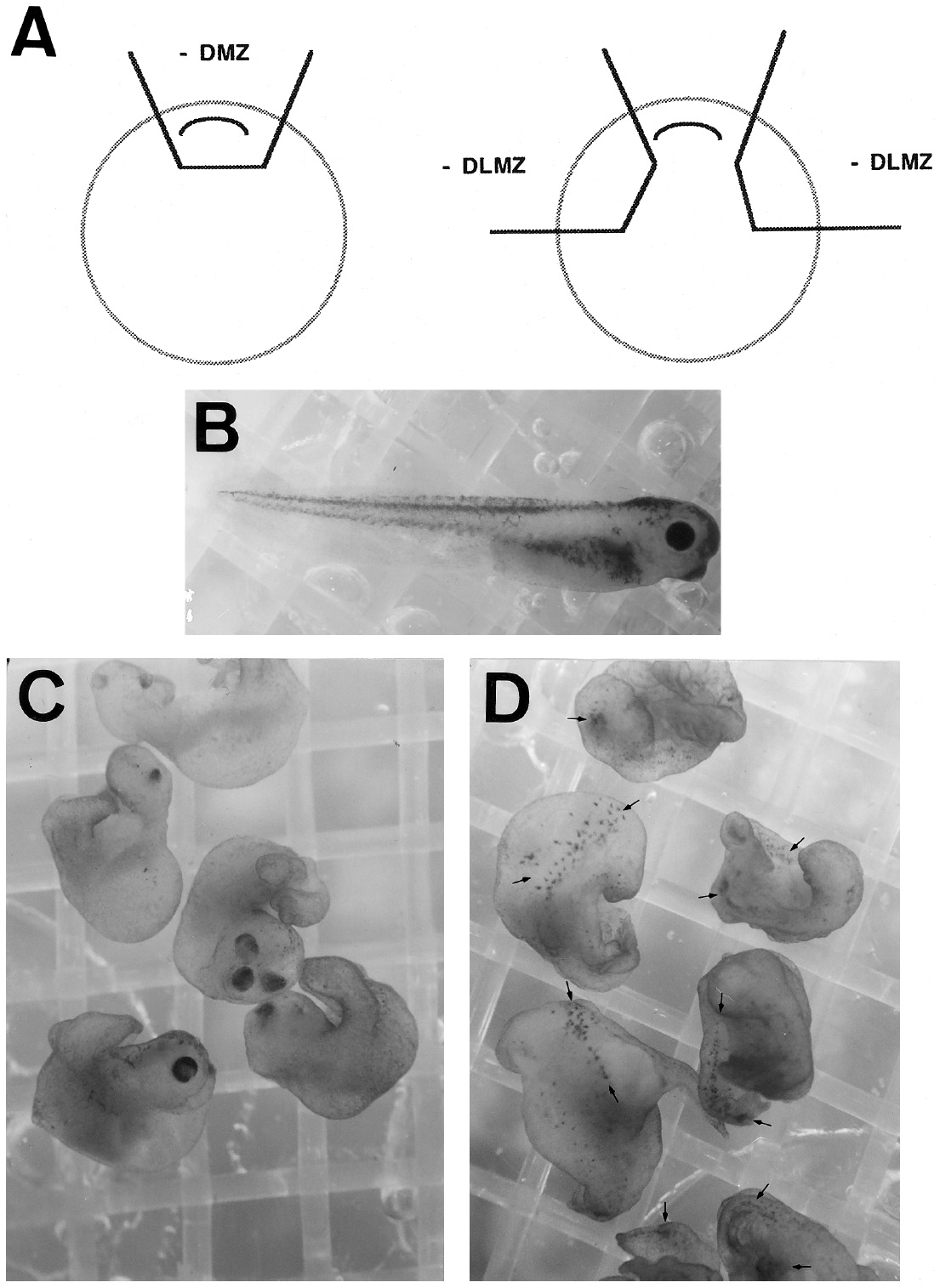 FIG. 4. Melanocyte formation is inhibited in embryos lacking paraxial mesoderm. (A) Embryos were dissected at stage 10.25â10.5. Either a 607 piece of the DMZ or both 607 pieces of the DLMZ were removed from nine embryos. Embryos were scored for melanocyte formation at stage 39â41. (B) A lateral view of a control embryo. (C) Embryos lacking a DLMZ region make heads and shortened trunks but lack melanocytes. (D) Embryos lacking a DMZ region make reduced amounts of anterior structures (eyes and cement glands) but contain large patches of trunk melanocytes (arrows mark patches of melanocytes).
