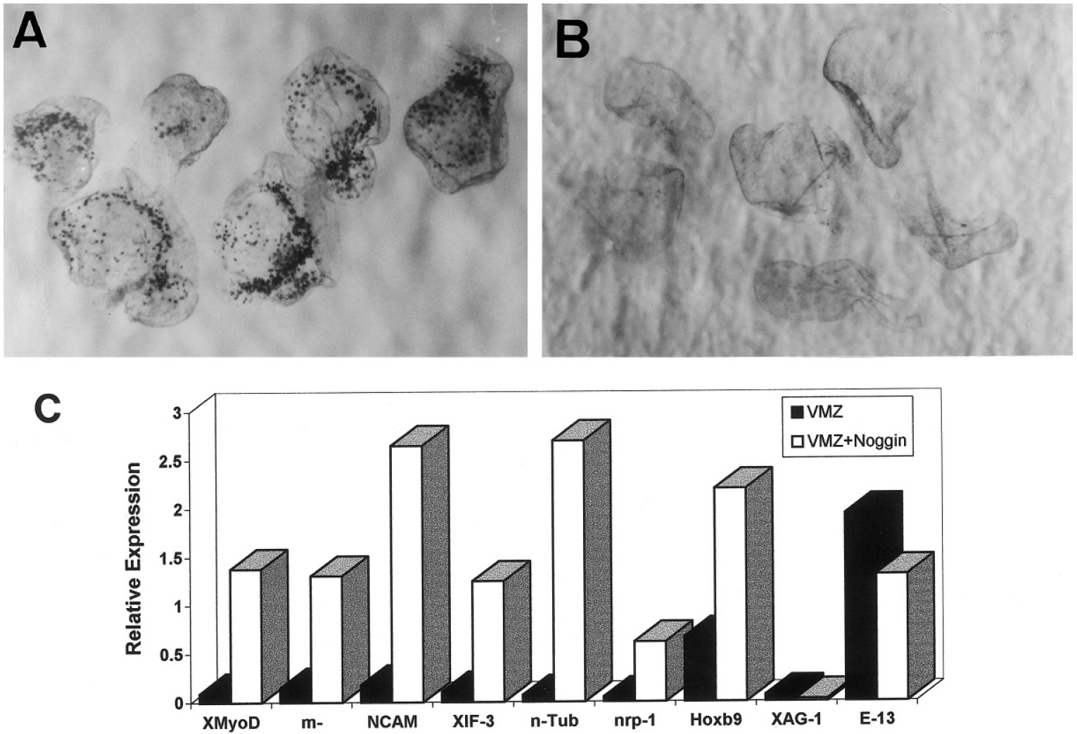 FIG. 1. Melanocytes and neural markers are induced in noggin-dorsalized VMZ explants. In a representative experiment, 36 VMZ explants were removed from stage 10/ to 10.25 embryos. Eighteen explants were noggin-treated until stage 12.5â13 and the 18 remaining explants served as controls. All explants were grown to stage 41 and scored for melanocytes. Approximately 75% of the noggin-treated VMZs made melanocytes in comparison to 5% of the controls. Embryos were fixed in MEMFA according to Hemmati-Brivanlou et al. (1990a) and cleared in 2:1 benzyl benzoate:benzyl alcohol before photography. (A) Six representative noggin-dorsalized VMZ explants. (B) Six representative control VMZ explants. (C) Induction of neural markers in dorsalized VMZ explants. Eighteen VMZ explants were removed from embryos at stage 10/ to 10.25. Nine explants were noggin-treated until stage 12.5â13, and 9 untreated explants served as controls. Explants were grown to several stages (20, 26, 36, and 41), and total RNA was isolated for Northern analysis. Total RNA was also isolated from pools of five whole embryos. All 9 explants and one embryo equivalent of RNA were loaded per well. Filters were sequentially hybridized with Xenopus cDNA probes for muscle-specific actin (m-actin), XMyoD, NCAM, nrp-1, XIF-3, n-tubulin, Hoxb9, XAG-1, E13 (epidermal cytokeratin), and EF1a. The results from stage 26 explants are shown; similar results (not shown) were observed at stages 20, 36, and 41. All data were quantitated as described under Materials and Methods.