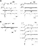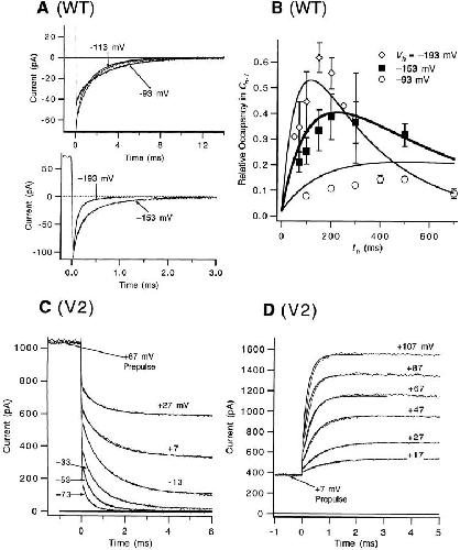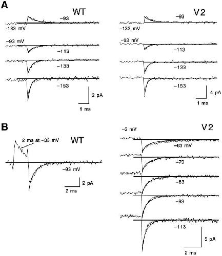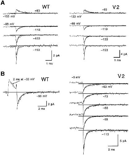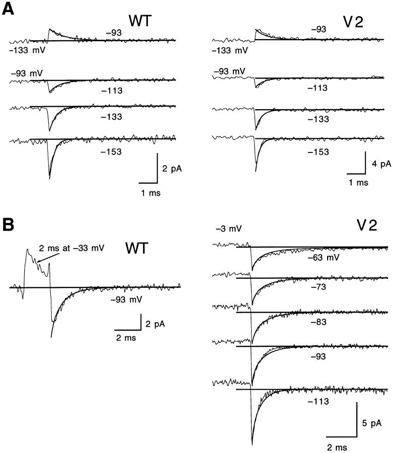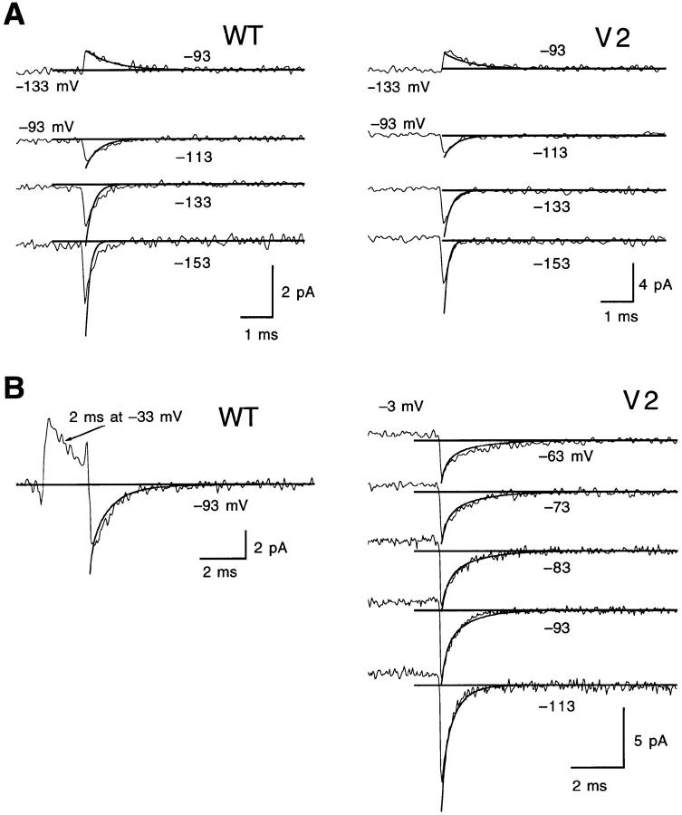 Figure 15. Scheme 3+2′ accounts for WT and V2's gating currents at most hyperpolarized voltages. Simulations are shown for (A) currents induced by voltage steps between −93 mV and more negative voltages, and (B) currents induced by step hyperpolarizations from intermediate prepulse voltages. Data are identical to the traces in Fig. 9. For the most negative test voltage in A (−153 mV), Scheme 3+2′ predicts a current that decays too rapidly, by roughly a factor of 2. This discrepancy reflects the 20% increase in qb1 that was introduced to help achieve a sufficiently large total gating charge (see text).