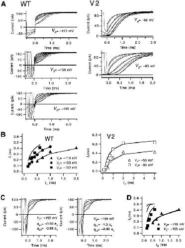 Figure 9. Scheme 2+2′ accounts for WT's and V2's gating currents at hyperpolarized voltages. Simulations are shown for (A) currents induced by voltage steps between −93 mV and more negative voltages (patches w249 and v240) and (B) currents induced by step hyperpolarizations from intermediate prepulse voltages (patches w217 and v417). In B, the duration of the prepulse was 2 and 20 ms for WT and V2, respectively. A short prepulse was used for WT to minimize the contribution of channels in the open state to the gating current time course.