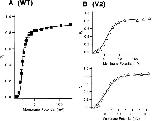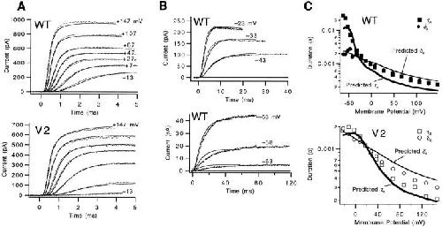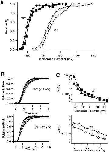 Figure 1. Patch-to-patch variabilities are apparent in WT and V2 voltage dependence of Po (A) and ionic current time courses (B). The Po-V plots were taken from two different patches each for WT and V2, and time courses were taken from seven different patches. The test voltages for the currents in B were −13 and +27 mV for WT and V2, respectively. (C) A comparison of the τa values at different test voltages from two WT and V2 patches shows that the variability in the current kinetics is well accounted for by a simple voltage shift.