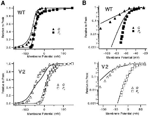 Figure 11. Scheme 2+2′ accounts for some but not all of the features of WT's and V2's equilibrium voltage dependence of channel opening and charge movement. WT and V2 plots are shown with ordinates that are either linear (A) or log transformed (B). The discrepancies in the fits are the largest for V2's linearly plotted Q-V relation and for WT's log-transformed values of Po. The model also slightly underestimates the steepness of the Q-V relation at the most hyperpolarized voltages (seen in B). For the linear plot, the values reflect mean ± SEM from one to eight experiments. The log-transformed data reflect single patch experiments (WT patches w158 and w249; V2 patches v206 and v240).