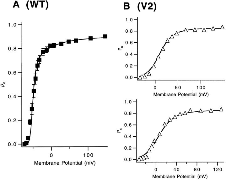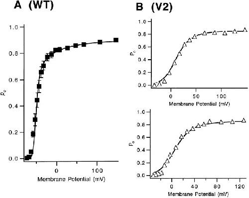 Figure 5. Fits of Scheme 0+2′ to the equilibrium Po at depolarized voltages for WT (A) and V2 (B). For V2, we have fitted Po-V relations obtained from current measurements made in two patches (v096 and v142). For WT, we have fitted the mean Po-V relation, since its complete Po-V relation was constructed using observations that were made in more than one patch (Schoppa and Sigworth, 1998a). In fitting WT's Po-V relation, we are here only interested in the shape of the Po-V relation at depolarized voltages, but needed to add several early transitions to Scheme 0+2′ to approximate Po at lower voltages. The model used wasin which we have added one set of four subunit transitions to Scheme 0+2′. For the modified model, the charge associated with S0 ↔ S1 was set at 2.55 e0 and its midpoint voltage was −53 mV. The simulations for V2 reflect Scheme 0+2′, but the values for βN-1(0) varied slightly from those in Table I; for the two patches, βN-1(0) was 17,000 and 14,000 s−1.