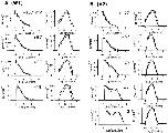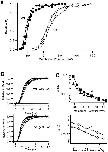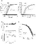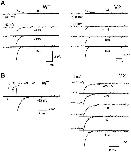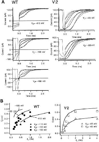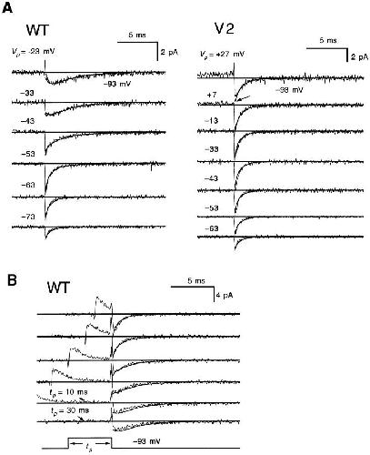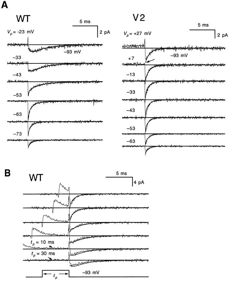 Figure 19. Fits of Scheme 3+2′ to WT's and V2's off gating currents after a range of prepulses of different amplitude Vp (A) and different duration tp (B). In B, WT's currents were measured after different prepulses to −33 mV that ranged in duration from 30 to 2 ms (bottom to top). The test voltage for all recordings was −93 mV. For WT's currents, the model accounts for the development of a slowly decaying off current with an increase in the amplitude or duration of the prepulse. The model also accounts for V2's faster off current decay kinetics. The arrow on V2's off current after a prepulse to +27 mV in A marks a small inflection in the simulated current that corresponds to a plateau phase. Data from patches w212 and v219 in A, and patch w217 in B.