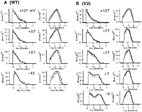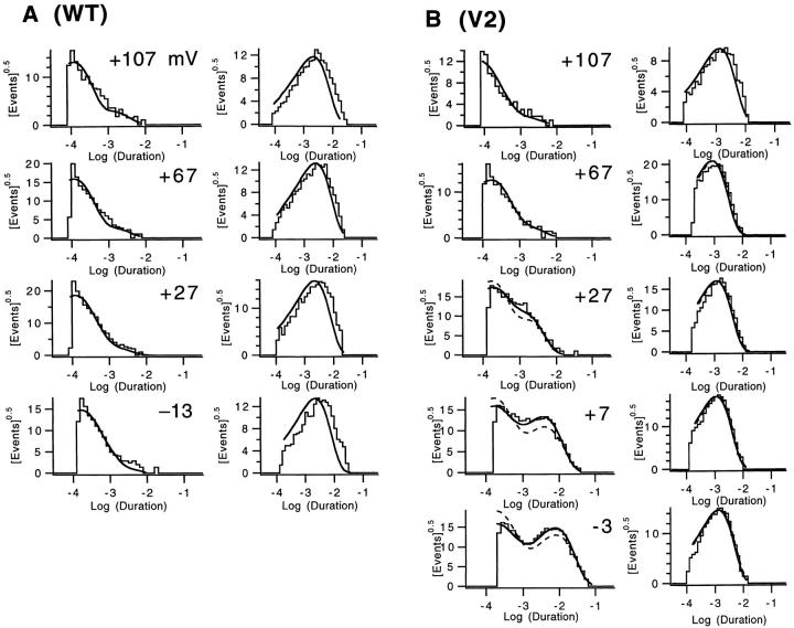 Figure 4. Fits of Scheme 0+2′ to the single-channel closed and open dwell-time histograms at depolarized voltages for WT (A) and V2 (B). For each channel, the closed time histograms are shown on the left, and open times on the right. Solid curves reflect the predictions of Scheme 0+2′ with the values in Table I. The dashed curves on V2's histograms were computed with parameters that are modified from those in Table I in the following way: βN-1(0) was set to 4,400 s−1 and the value αN-1(0) = 300 s−1 was chosen to best fit the closed time histograms. The solid and dashed curves are not always distinguishable. All data are from the same two patches (w265 and v433), except at +107 mV (w266 and v344).
