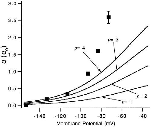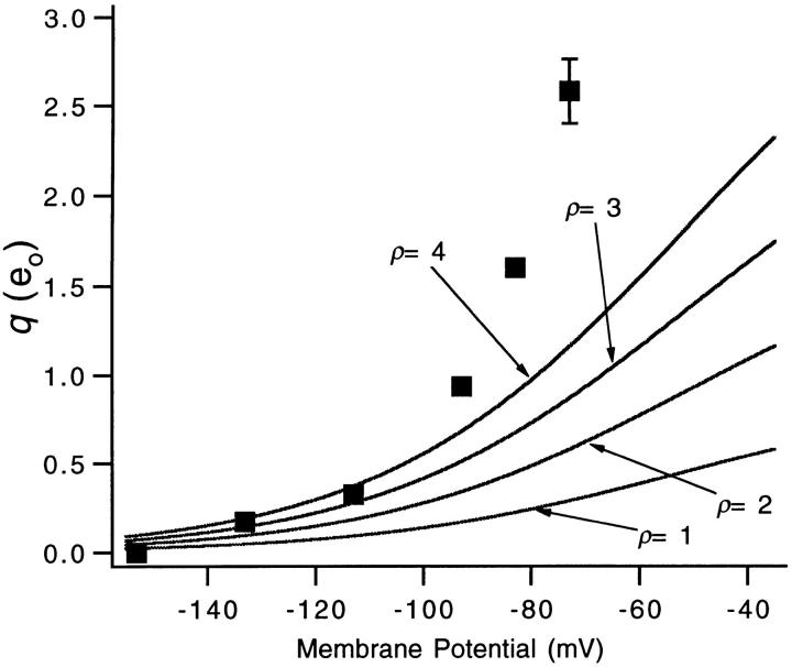 Figure 6. The magnitude of the average, absolute charge movement per channel at negative voltages was used to test the “n4” scheme as a model of the first gating transitions. The solid curves were computed from a model assuming a number p of equivalently acting subunits, for which the charge movement q is given by For each curve the charge z1 and midpoint voltage V1 for the transition were fixed to 0.89 and −53 mV, which are the charge and midpoint voltage values of the very first gating transition derived from the kinetic estimates of α1 and β1. The displayed charge values reflect the same data as in Fig. 1 in Schoppa and Sigworth (1998a), except scaled by the estimate of the single channel charge movement q = 12.3 e0 reported in Schoppa et al. (1992). The error bars are smaller than the symbols for most of the values.