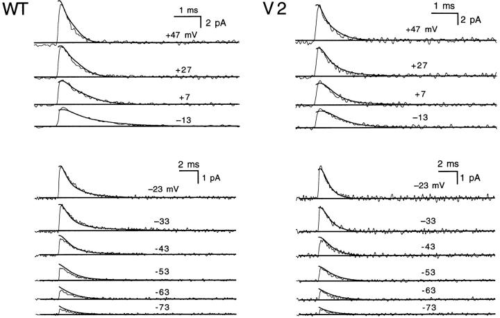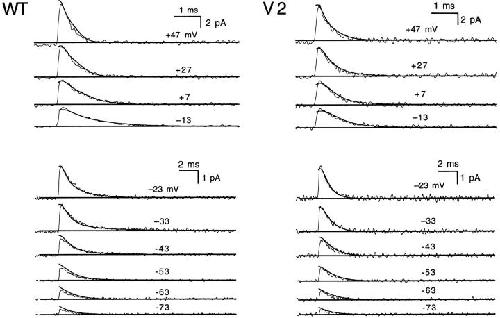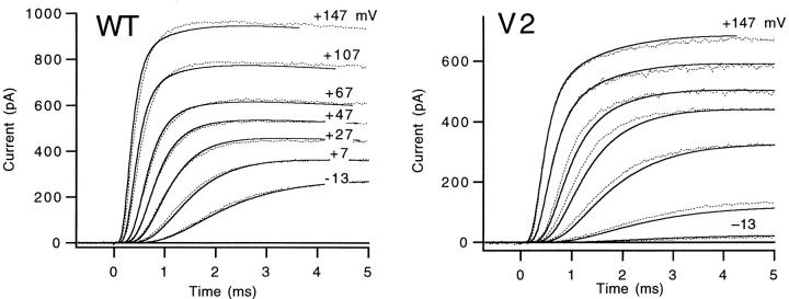Figure 14. Scheme 3+2′ accounts for WT's and V2's on gating currents across a wide voltage range, between −73 and +47 mV. All current traces come from the same two WT and V2 patches (w212 and v219). Notably, at −33 mV, the model accounts for a slow component that is present in WT's current, but absent in V2's current. The holding potential was −93 mV in these recordings.