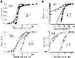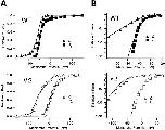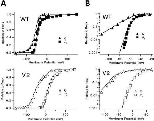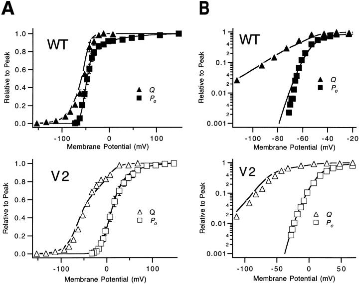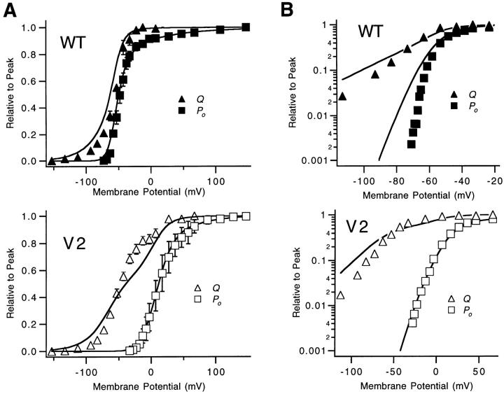 Figure 17. Scheme 3+2′ performs much better than Scheme 2+2′ at predicting certain features of WT's and V2's equilibrium voltage dependence of channel opening and charge movement, including the steepness of V2's Q-V relation and the voltage sensitivity of WT's Po at low Po. As in Fig. 11, plots are shown with ordinates that are linear (A) or log transformed (B).