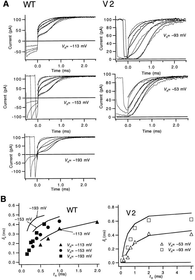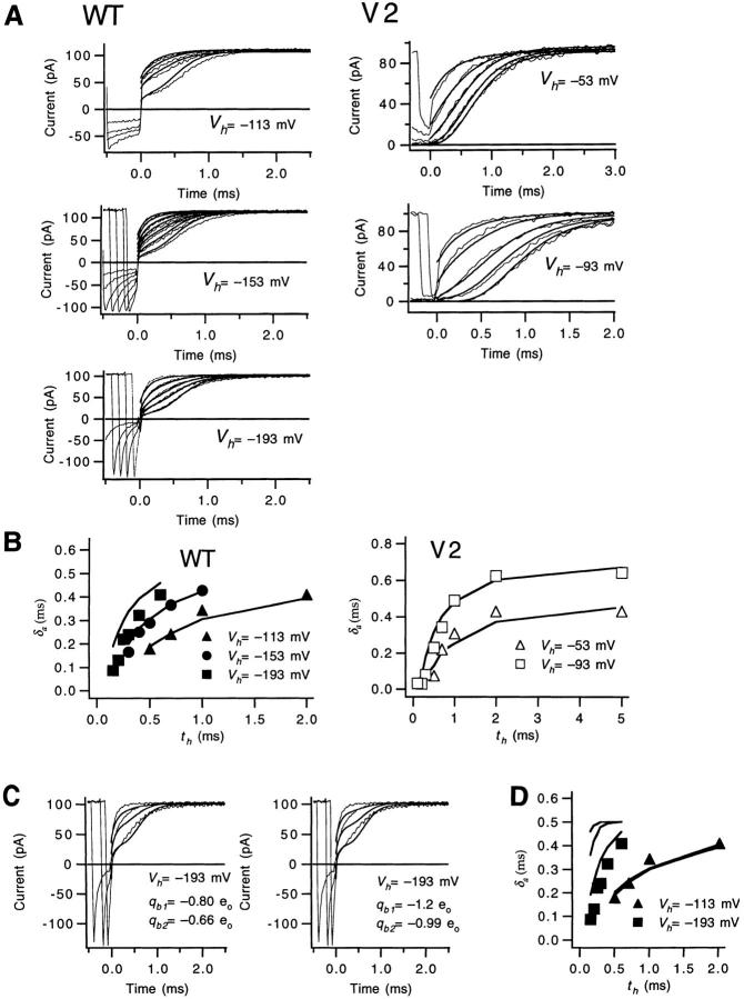 Figure 10. Fits of Scheme 2+2′ to WT and V2 reactivation kinetics. (A) Scheme 2+2′ accounts for WT and V2's reactivation time courses after hyperpolarizations of various amplitudes Vh (between −53 and −193 mV) and duration th. Test voltages were +37 and +67 mV for WT and V2, respectively. All of the displayed data come from the same WT and V2 patch recordings and correspond to the following th values. WT: for Vh = −113 mV, th = 0.5, 0.7, 1, and 2 ms; for Vh = −153 mV, th = 0.1, 0.2, 0.3, 0.4, 0.5, 0.7, and 1 ms; for Vh = −193 mV, th = 0.1, 0.2, 0.3, 0.4, and 0.6 ms. V2: for Vh = −53 mV, th = 0.2, 0.5, 1, 2, and 5 ms; for Vh = −53 mV, th = 0.1, 0.2, 0.5, 1, and 5 ms. In the simulations, for WT, a1 and a2 were each increased by 20% compared with the values in Table II, and the values for βN-1(0) and βN(0) were 520 and 280 s−1. For V2, βN was changed to 1,100 s−1. Data are from patches w448 and v162. (B) Scheme 2+2′ accounts for the delay δa in WT and V2's reactivation time course for different Vh and th. The δa values were derived from the measured and simulated currents from A. (C and D) WT's reactivation time courses were used to place constraints on the sizes of qb1 and qb2. For reactivation time courses measured after Vh = −193 mV, values for qb1 and qb2 that are two or three times as large as the values in Table II predict a reactivation delay that is too long. In D, the three superimposed lines to the left of the squares reflect δa values derived from simulated currents for the qb1 and qb2 values in Table II (the best fit) or qb1 and qb2 values that are two or three times larger. For these simulations, the values of b1(0) and b2(0) were first adjusted to achieve good fits of WT's reactivation time course for Vh = −113 mV (shown by the derived δa values in D).