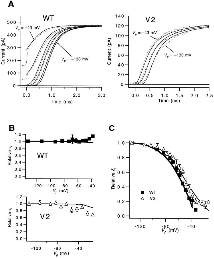 Figure 18. Fits of Scheme 3+2â² to WT's and V2's ionic current measured after prepulses of different amplitude Vp. The test voltages used were +37 mV for WT and +107 mV for V2. (A) Scheme 3+2â² accounts well for the current time courses measured for wide range of Vp values. These simulations were made while incorporating changes to Scheme 3+2â² identical to those described for Scheme 2+2â² in Fig. 8; that is, we include the transition from the last closed state to the state CiN-1 (and also the transition CiN-1 â CiN). The rates for these additional transitions are those given in the legend to Fig. 8, except that rate of CN-1 â CiN-1 for V2 (at +147 mV) was increased from 6,700 to 8,600 sâ1, to account for the relatively large amplitude of the slow activation component observed in this patch recording. Also, for WT, a1, a2, and a3, were each increased by 4% compared with the values in Table III; for V2, each were increased by 10%. Data are from patches w139 and v148. (B and C) The good fits of the ionic currents are also reflected in a comparison of the normalized Ïa and δa parameters (symbols, lines) derived from the measured/simulated currents for different Vp. WT's and V2's experimental Ïa and δa values reflect the mean ± SEM from one to four experiments. The Ïa values derived from V2's measured/simulated currents reflect the fast time constant in fits of these currents to the sum of two exponentials.